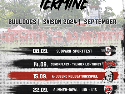 Hallo Bulldogs, wie jedes Jahr endet die Sommersaison zum 01. Oktober.Bedeutet grundsätzlich:Wir trainieren nicht mehr im Helmut-Schleusener-Stadion, sondern auf anderen Plätzen und... Read More
