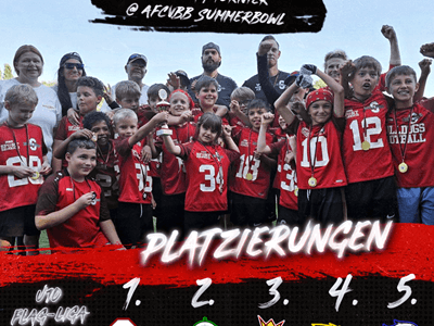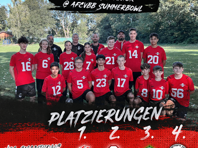 Am Wochenende gab es vom Verband AFCVBB das Saison-Abschluss-Turnier, den sogenannten Summer-Bowl. Für unsere U10-Flag-Liga gab es 5 Teilnehmer und mit 3... Read More