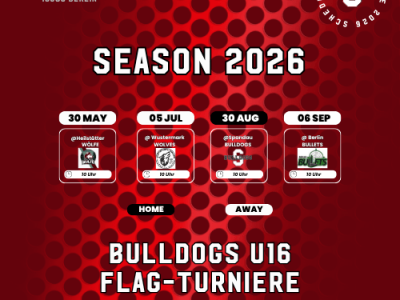 Flag U16 – Spielplan 21.04.2026 Unsere U16 hat auch vier Turniere vor sich und ihr dürft gerne supporten 🙂 Am 30.08. findet dann das Heim-Turnier im Helmut-Schleusener-Stadion... Read More0