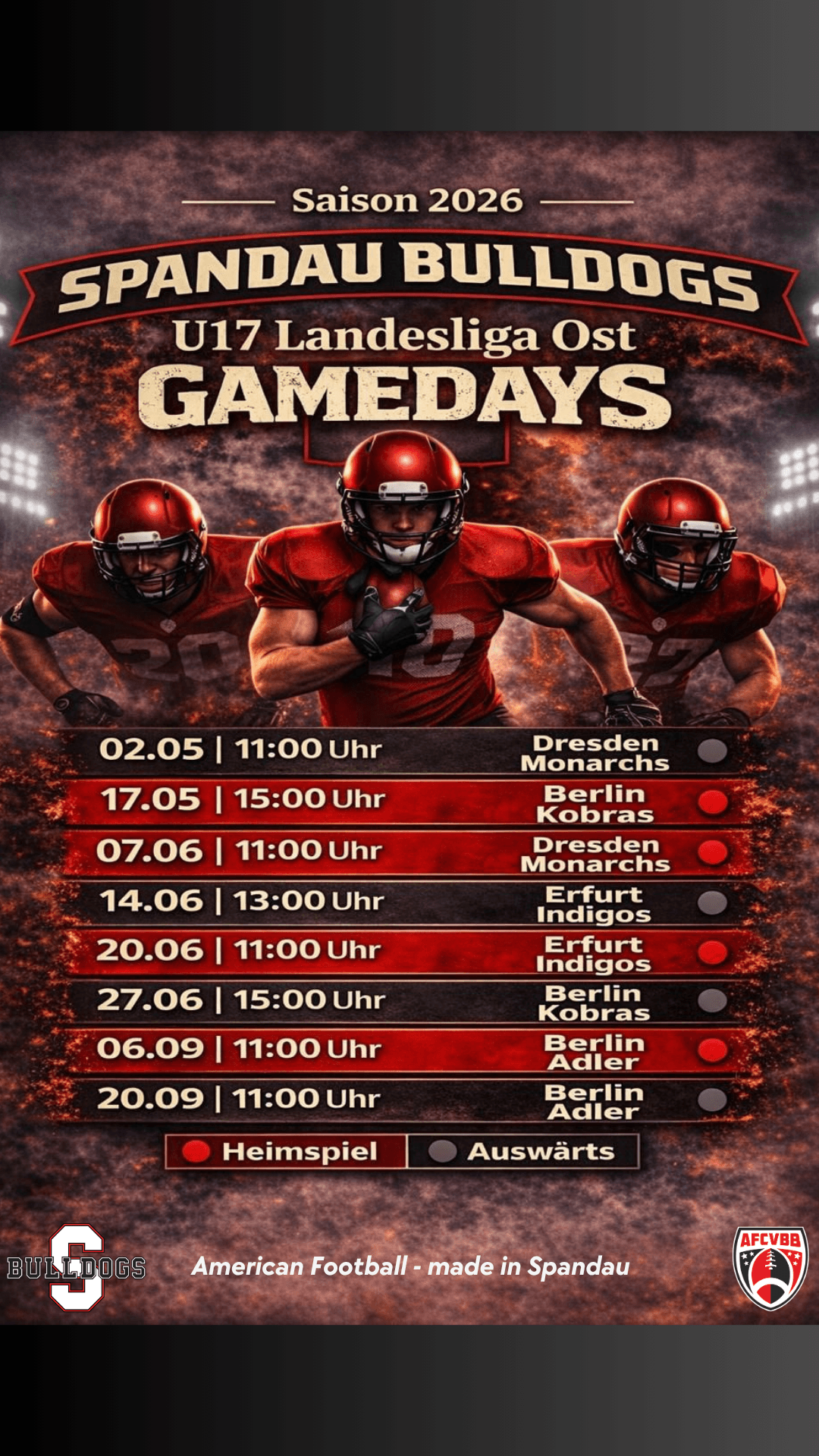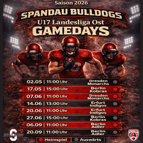 Jetzt soll aber alles fix sein und hier findet ihr nun die bestätigten Spielansetzungen für 2026 unserer Tackle-U17.